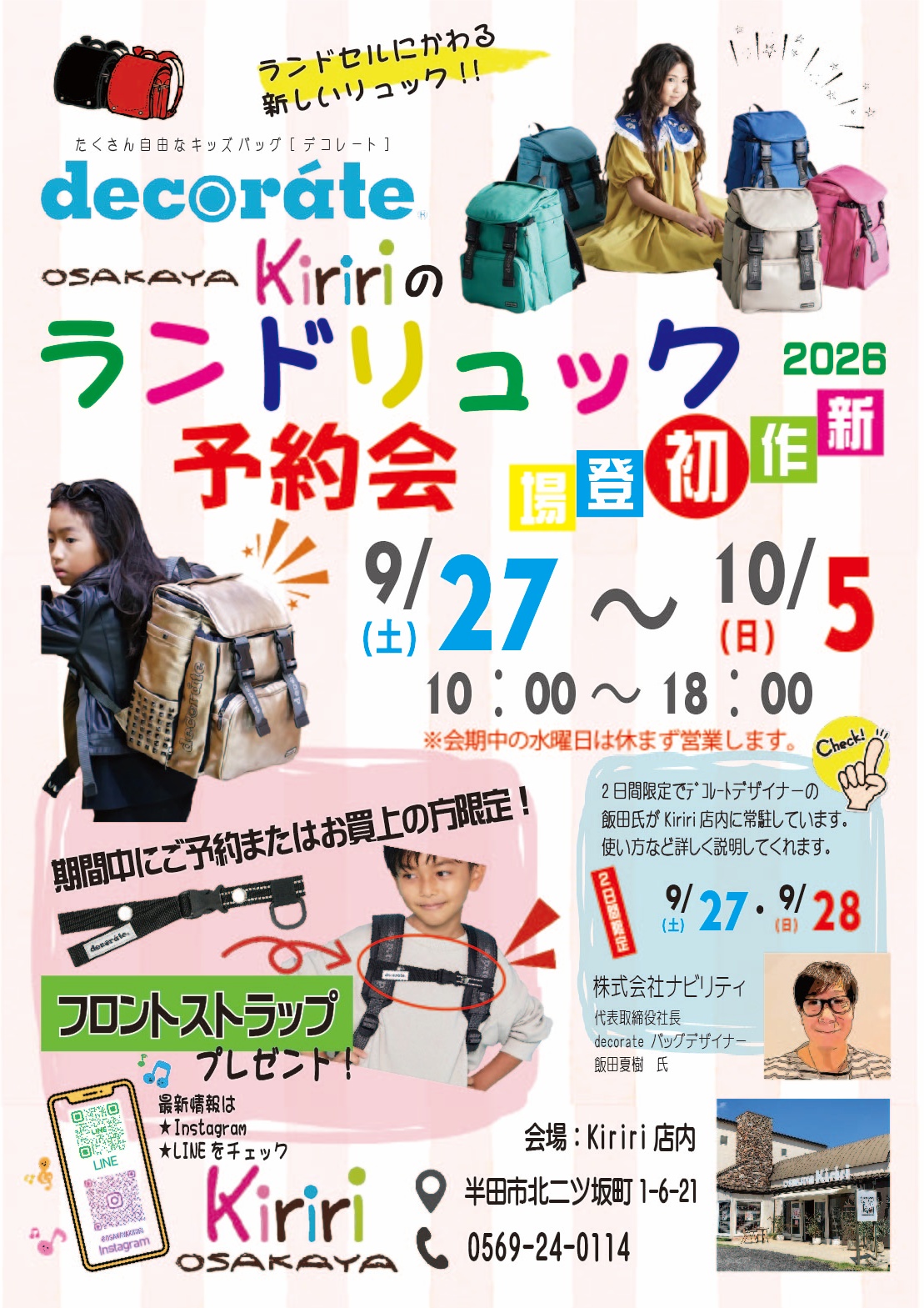 毎年新1年生に大人気のランドセルとして使えるデコレートのランドリュック予約・販売・体験会を今年も9月にOSAKAYA Kiriri店内にて開催します。